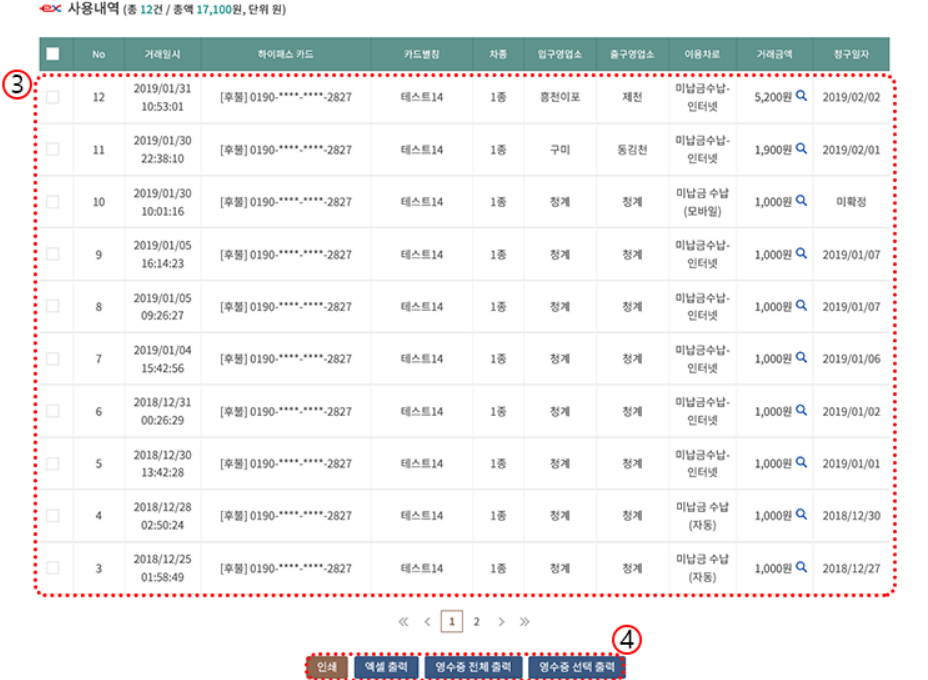 조회가 완료되면, 사용 내역이 표 형태로 나타납니다. 여기에는 거래 번호, 날짜 및 시간, 카드 정보, 차량 종류, 진입 및 출구 위치, 통행료, 결제 날짜 등의 정보가 포함되어 있습니다. 필요한 경우, 추가 페이지를 통해 더 많은 내역을 확인할 수 있습니다.